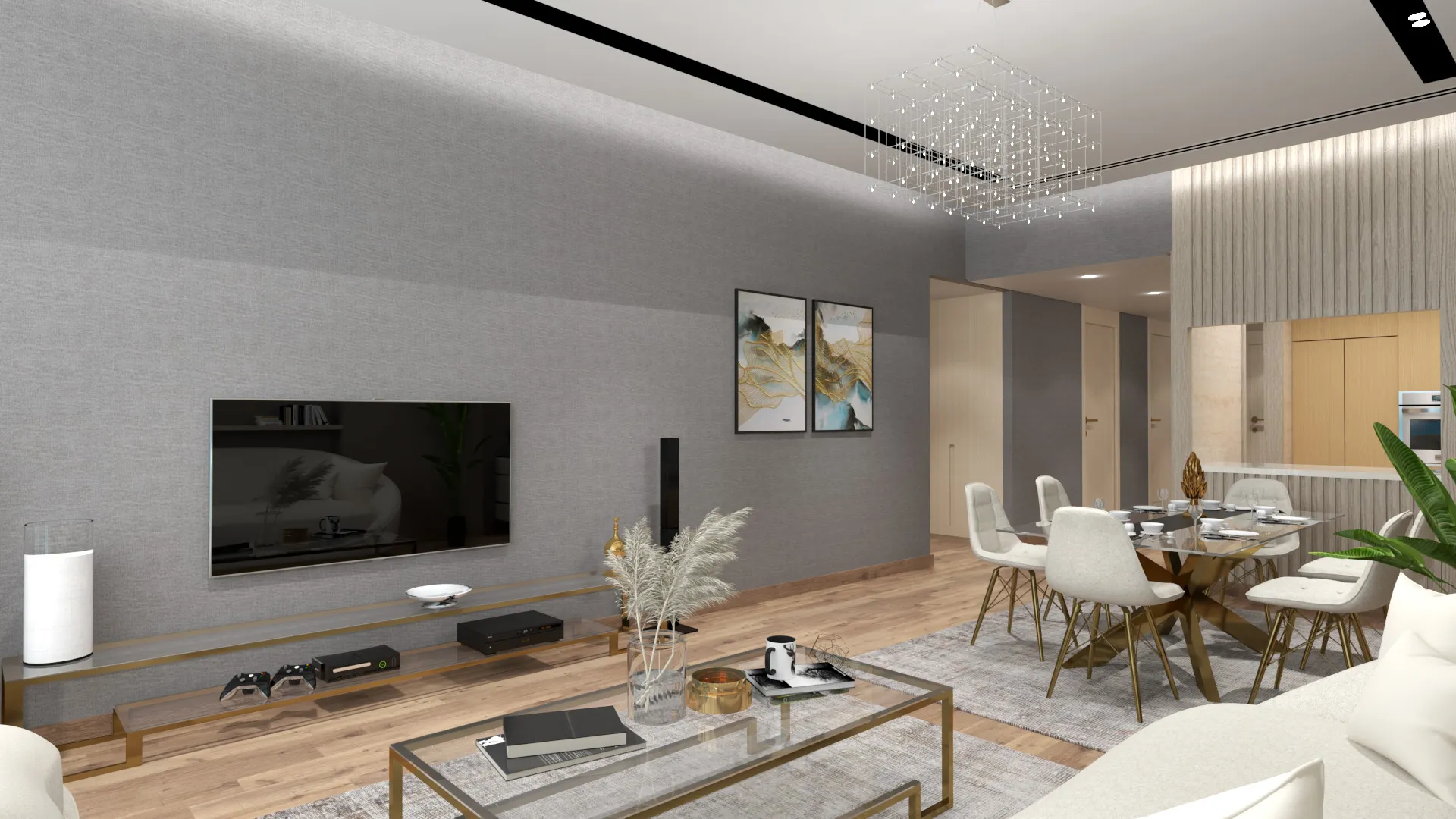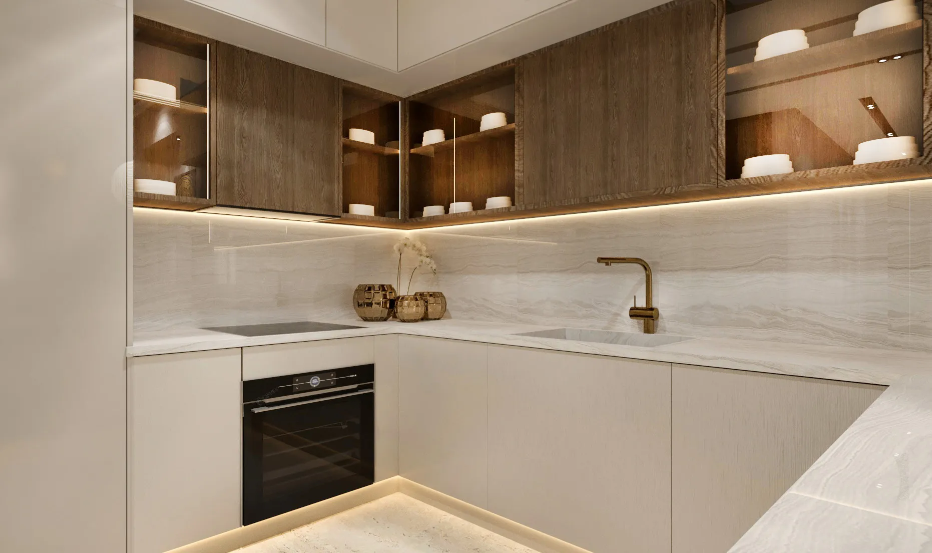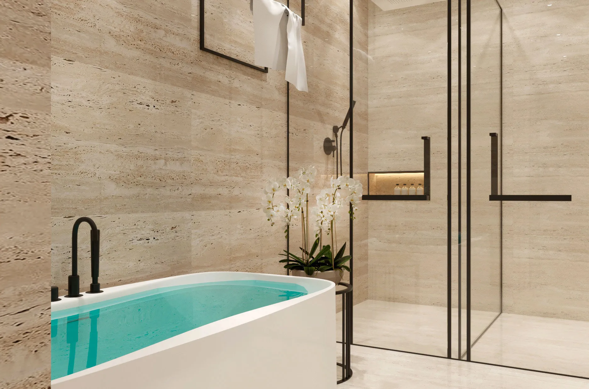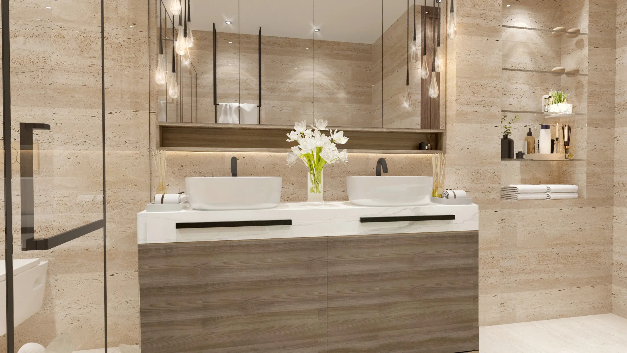 tiles, accent lighting, creating a grand yet warm ambiance. As you enter