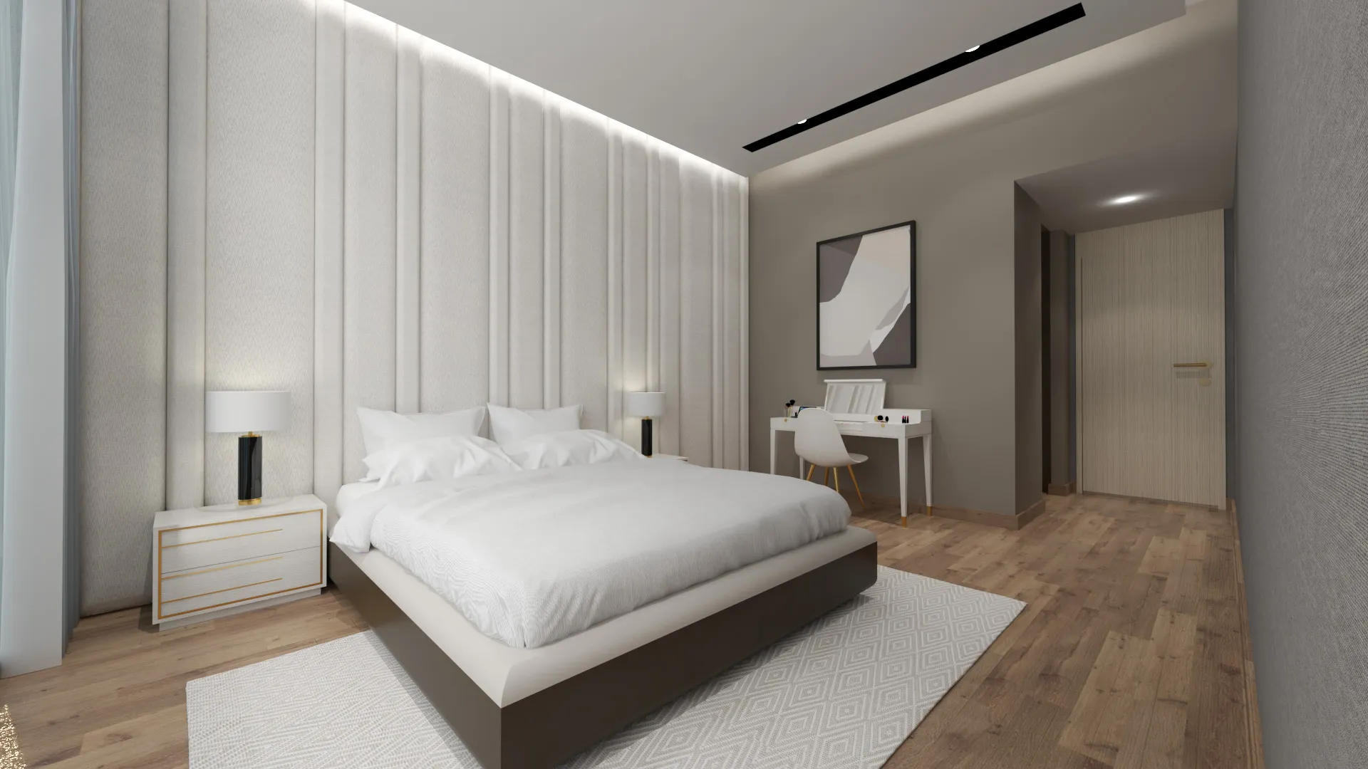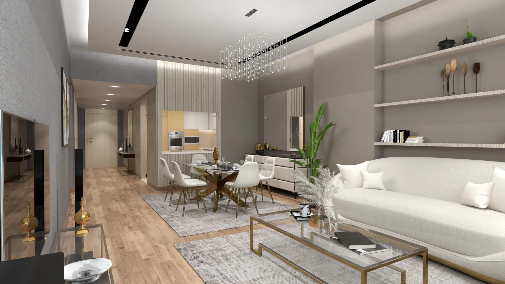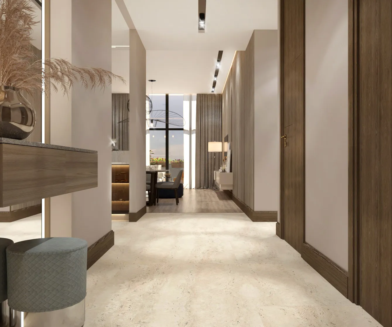 The hallway leading to the bedrooms is framed by floor-to-ceiling wooden