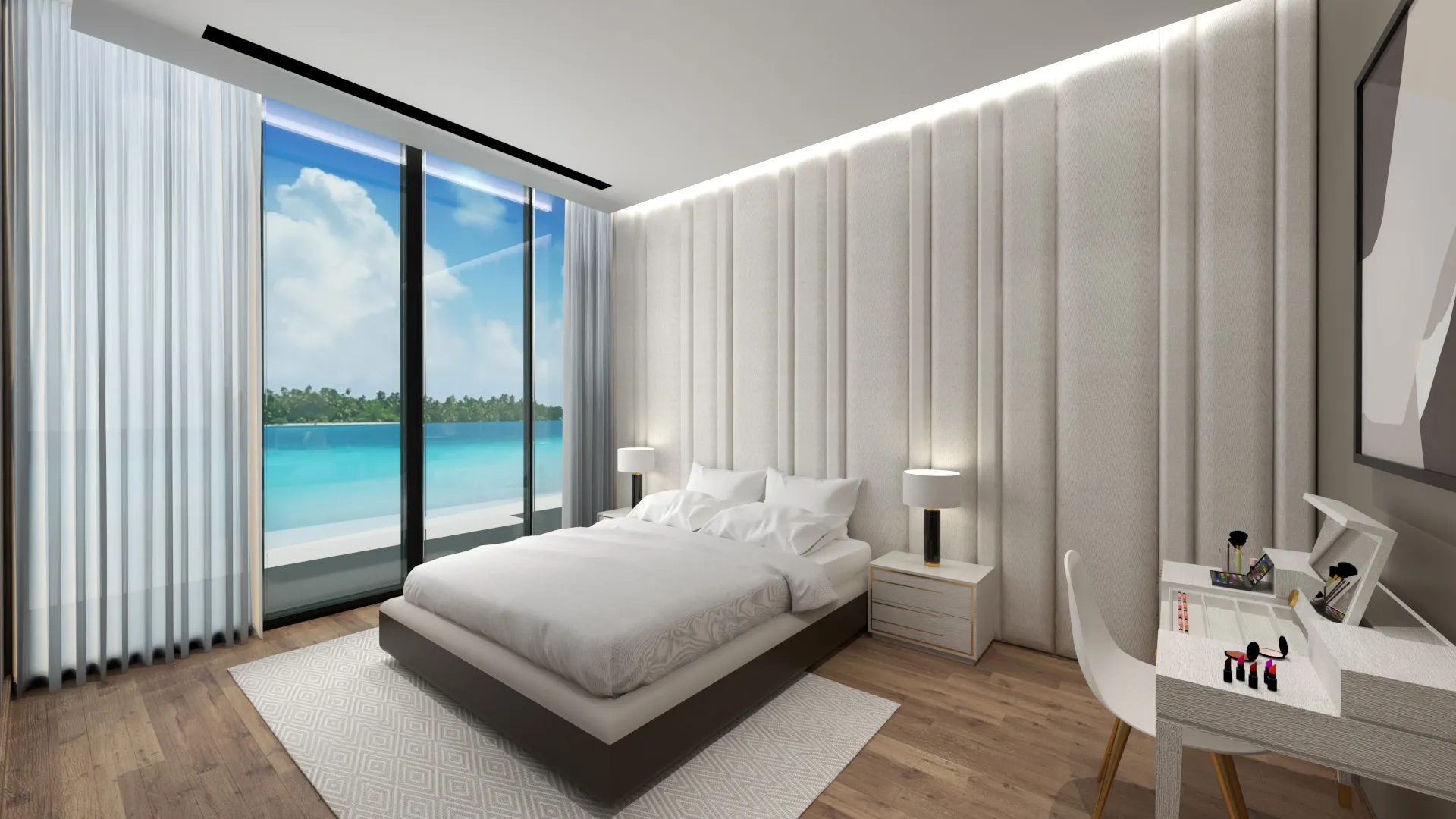 the bedrooms at Reem Five, floor-to-ceiling windows greet you, offering magnificent views, and dressing the room with sunlight. The walls are accented with light brown wooden tiles and mood lighting. Spacious and beautifully crafted closets complete the luxe experience.
