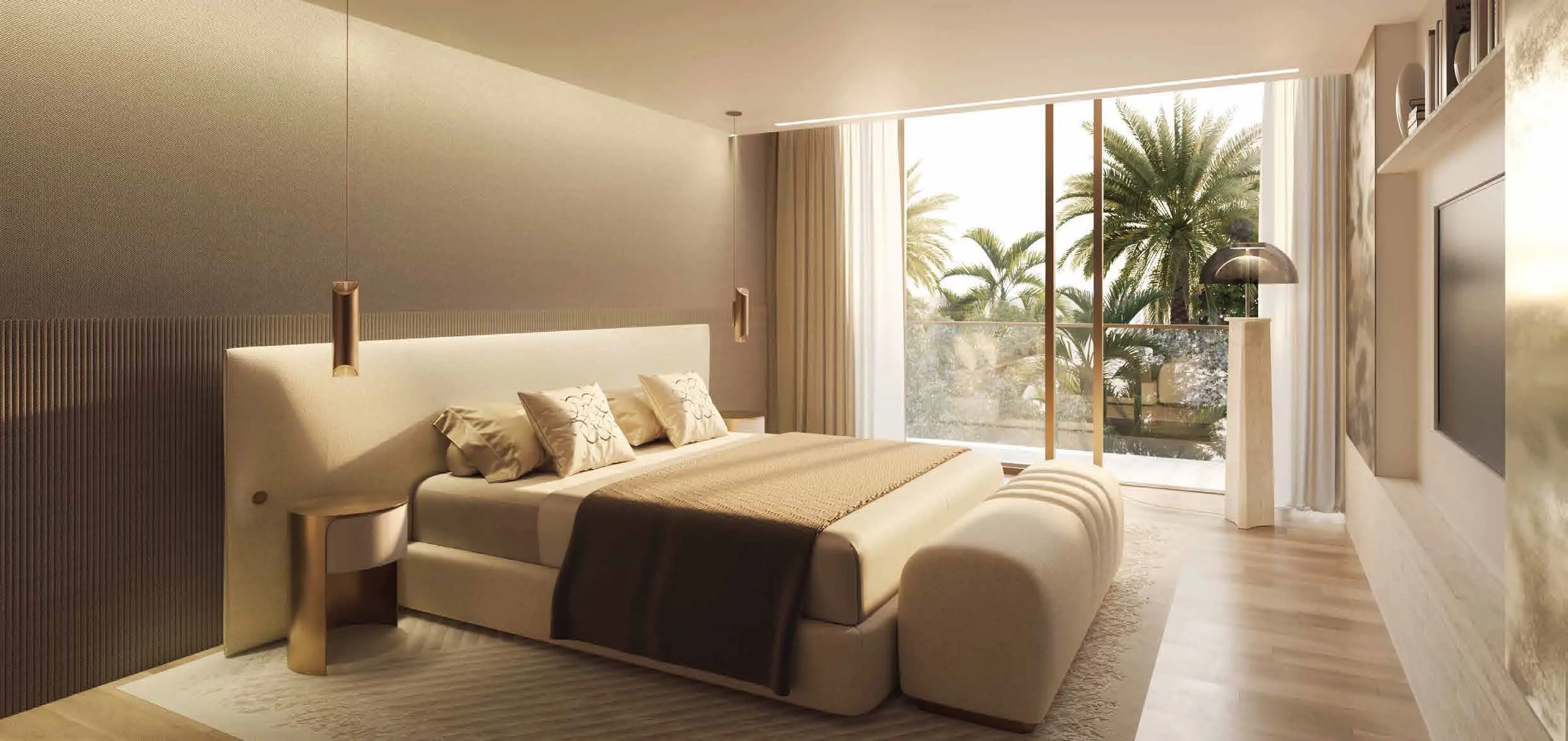 The master bedroom harmoniously blends architectural balance with refined intimacy. Soft palettes, tactile fabrics, and subtle lighting cultivate an atmosphere of comfort and distinction. Accents of white travertine and light oak reflect the home’s material language, while curated ELIE SAAB Maison pieces infuse the space with an unmistakable signature of style. The result is a sanctuary that embodies ELIE SAAB’s vision of timeless elegance, where design and emotion coexist in perfect equilibrium.